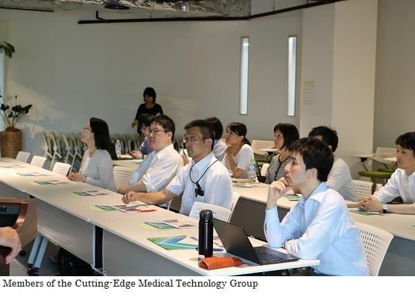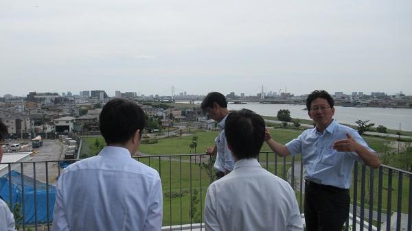 On a day when the sun was beating down as if the middle of summer, 11 members of the Cutting-Edge Medical Technology Group of the Healthcare New Frontier Promotion Headquarters Office visited the Tonomachi King Skyfront. At the 4th-floor seminar room in RGBT2, Mr. Suzuki, the administrative director, gave a talk on the features of the seminar room interior and server room, followed by Project Professor Yoshimoto (Organizer, JST Research Complex Program) who presented an overview of the research complex. Finally, Group Leader Yoshiyuki Makino of the Cutting-Edge Medical Technology Group explained the roles of and specific efforts made by the prefecture as the representative of the region, as well as mentioning episodes from the earliest days when the Research Complex Program began. After the visitors had deepened their understanding of activities through a variety of questions, the group moved out onto the North Terrace where they listened attentively to stories of how the Tonomachi landscape had changed over the past 3 to 4 years, as well as about the road connecting to Haneda Airport that is due to be completed in 2020.